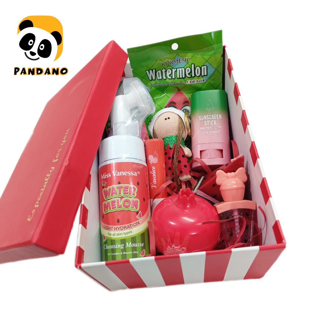 این پک کادویی بسیار جذاب و کاربردی حاوی جاسوئیچی عروسک روسی طرح هندوانه 8 سانت، بالم لب انار برند وازلین، کرم دست وکالی مدل انار، فوم شستشوی صورت هندوانه میس ونسا، ماسک صورت انار ورقه ای، لیپ گلاس هدی موجی طرح هندوانه، شمع مثلثی طرح هندوانه و پوشال تزئینی می باشد.