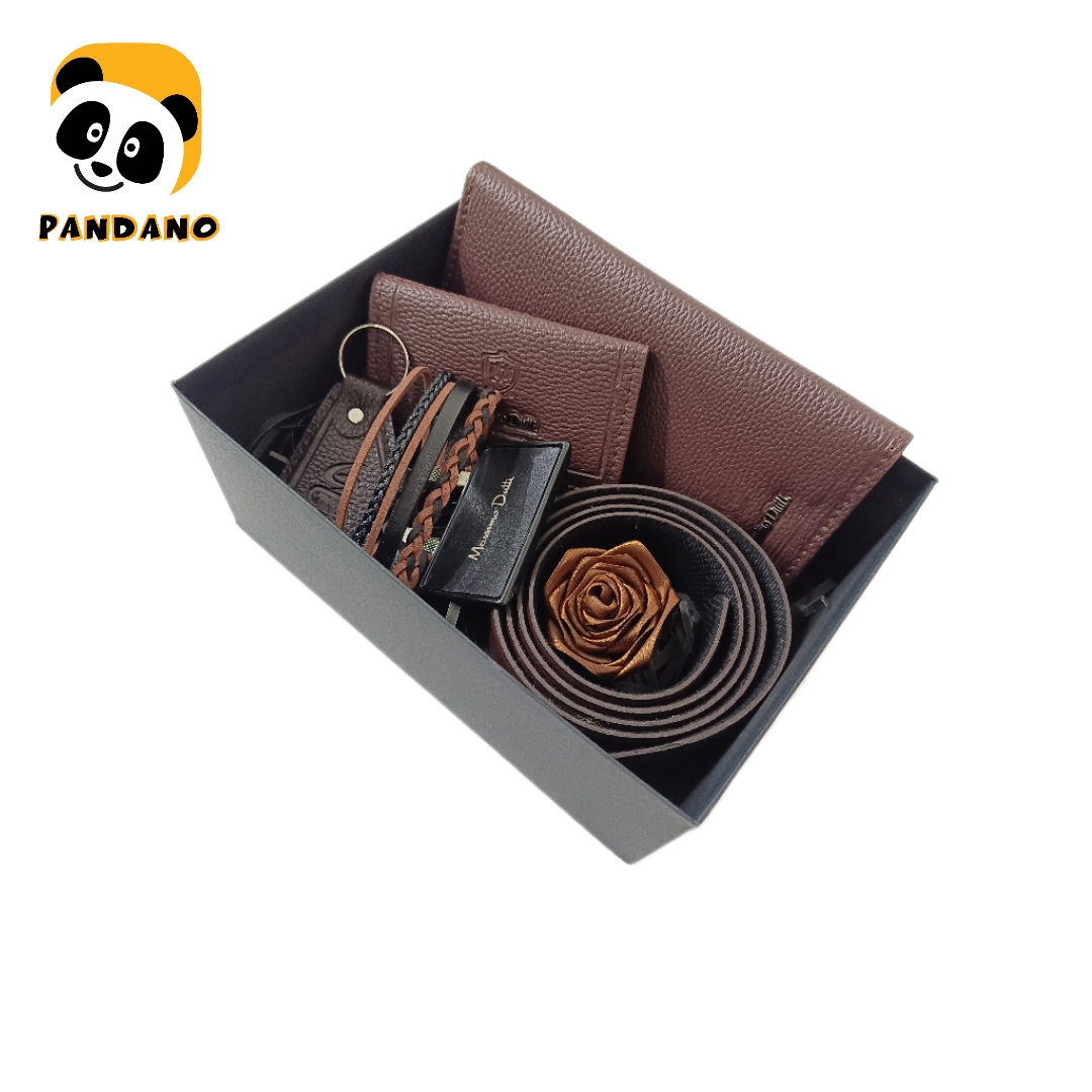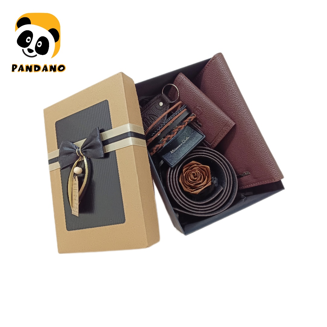 این پک هدیه جذاب و کاربردی حاوی دستبند چرم دست ساز مردانه قهوه ای، کمربند به همراه سگک قهوه ای ست لاورز، کیف بلند قهوه ای ست لاورز، جا کارتی قهوه ای ست لاورز، جاسوئیچی قهوه ای ست لاورز، یک عدد گل رز ساتن قهوه ای و پوشال تزئینی می باشد.